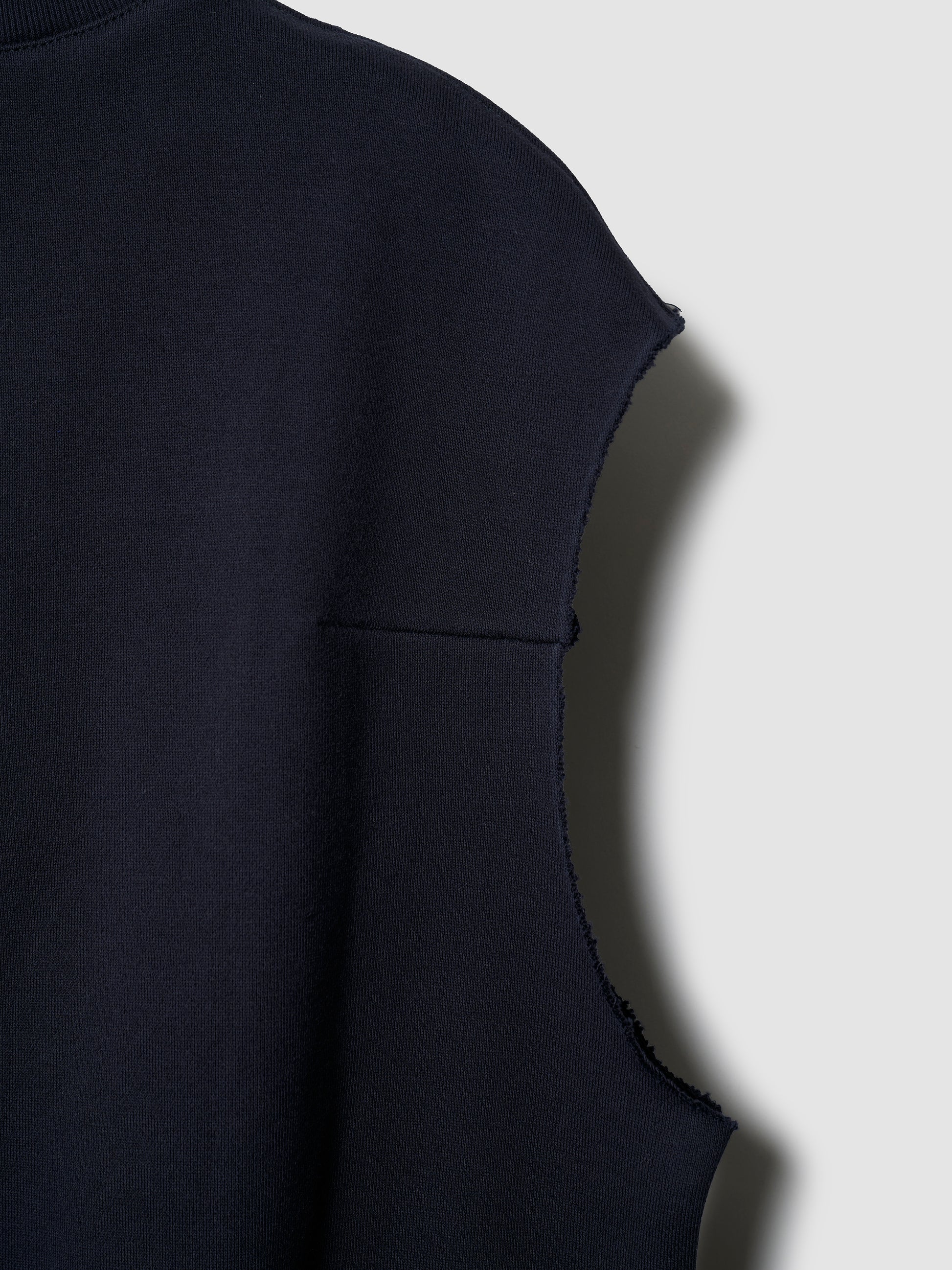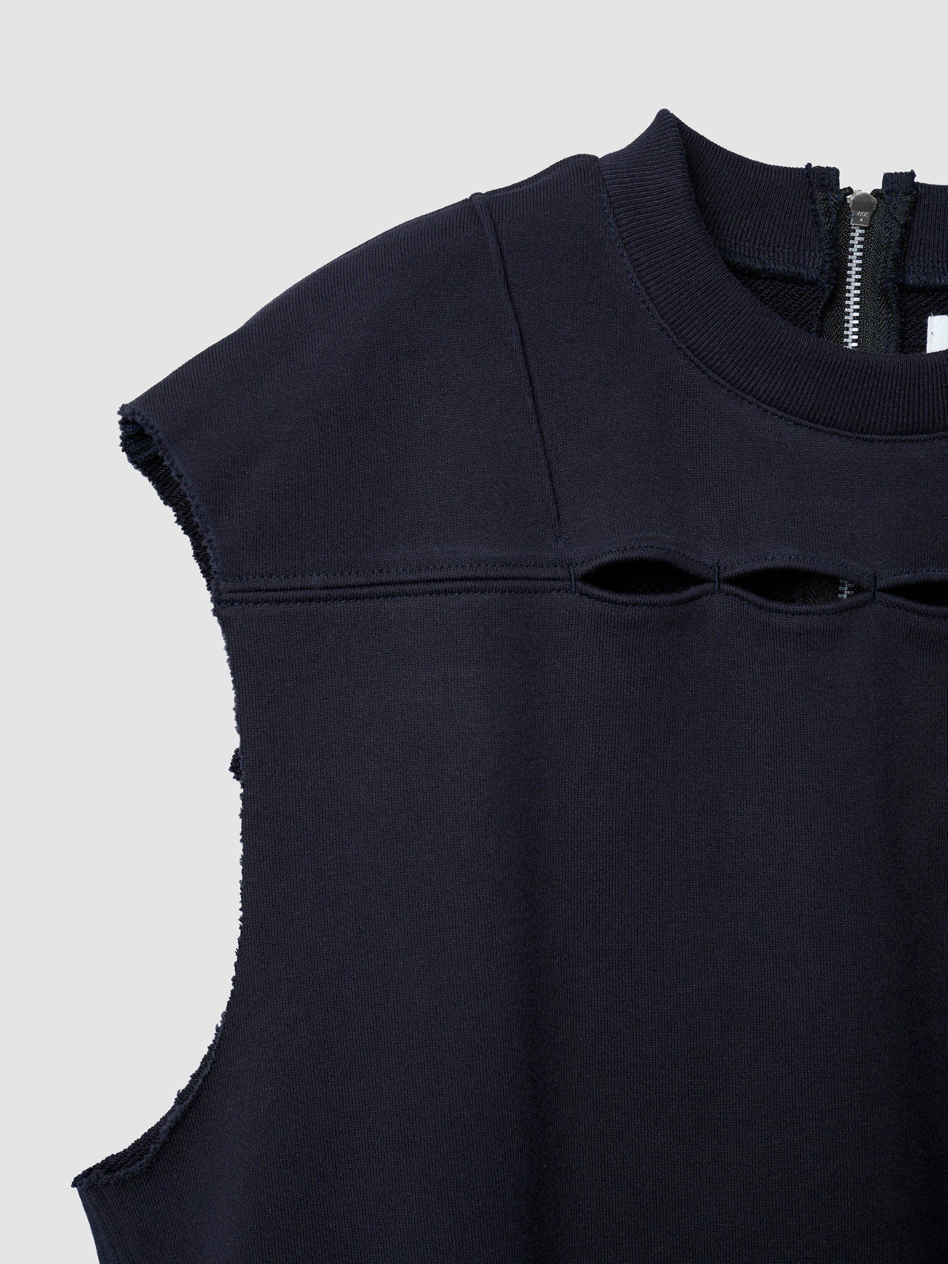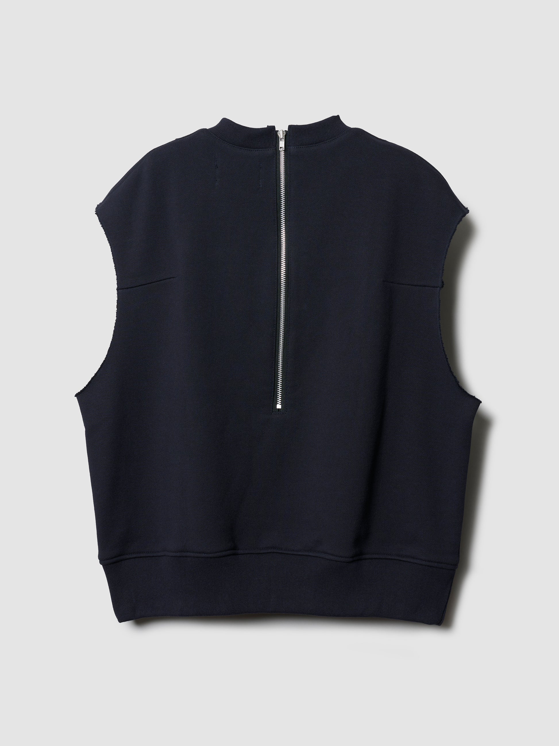 ボックスシルエットのスウェットベスト。カットオフされた袖と、インナーレイヤーがチラ見えするフロントのデザイン、そして背面にあしらった存在感のあるファスナーが特徴的。しっかりとした厚手の、黒に近いダークネイビー素材だが、裏起毛ではないのでオールシーズン着用可能。