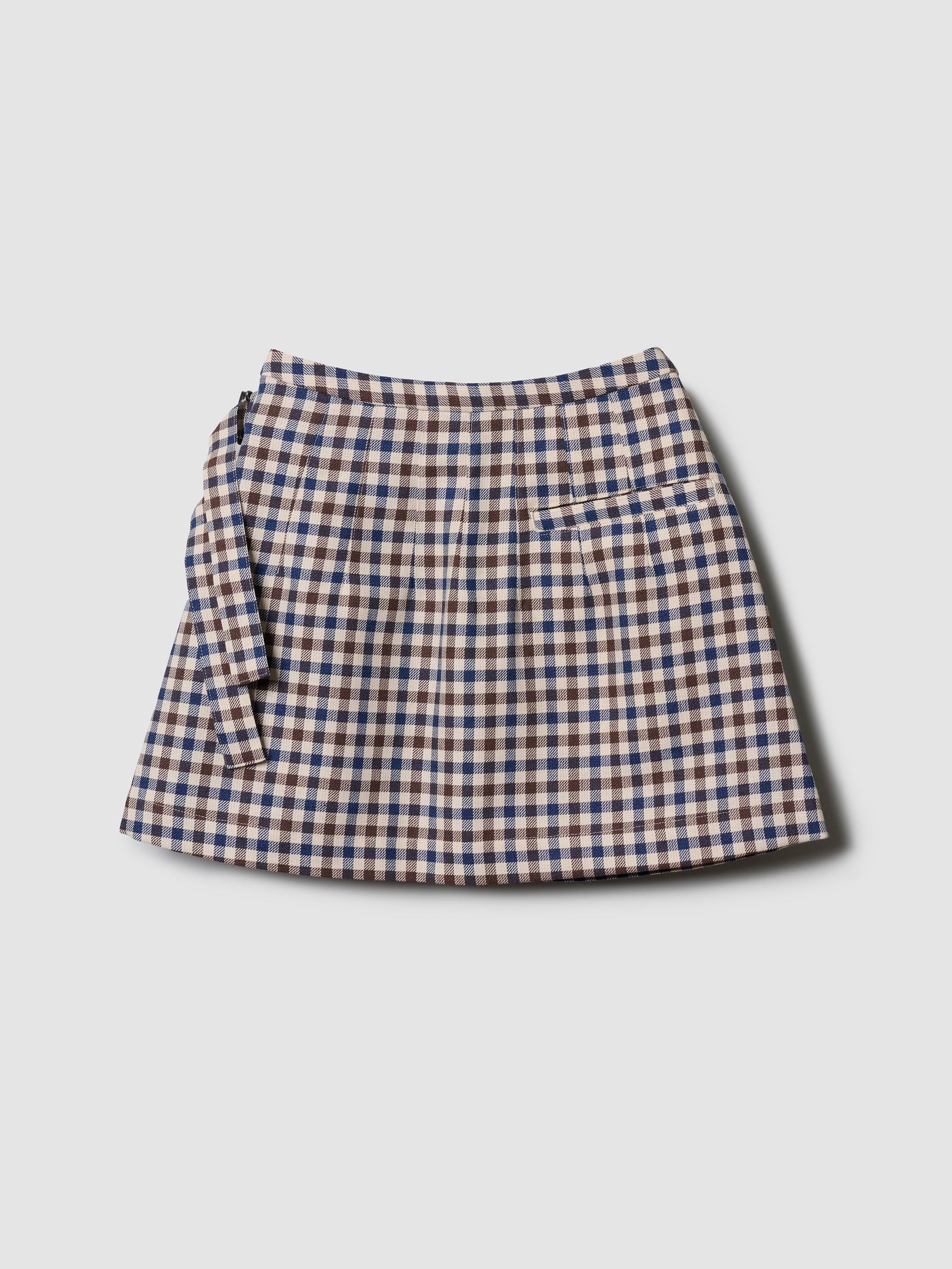 “ラップスカート×実用的なエプロン”のイメージから生まれたアイテム。あえてミニ丈にしてポケットをフロントに施し、ツールエプロン風のデザインに仕上げました。二つのバックルとベルトもアクセント。ヒップには片玉縁ポケットを1つ配置。裏地付き。レイヤードスタイルにおすすめのアイテムです。