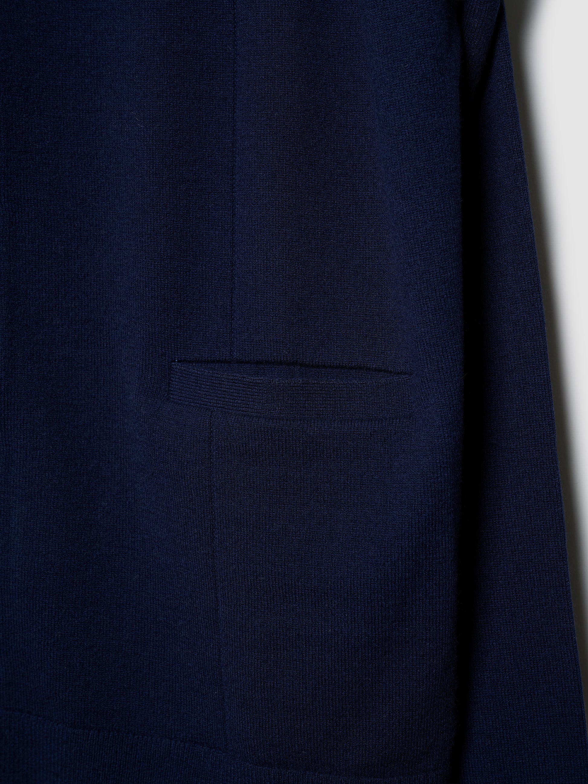 フロントの肩から裾にかけて“たたみジワ”をイメージした編みラインをあしらった襟付きカーディガン。配色でレイヤードした袖口がポイント。フロントにはポケット付き。まるでカシミアのようななめらかな肌触りのウールを使用。