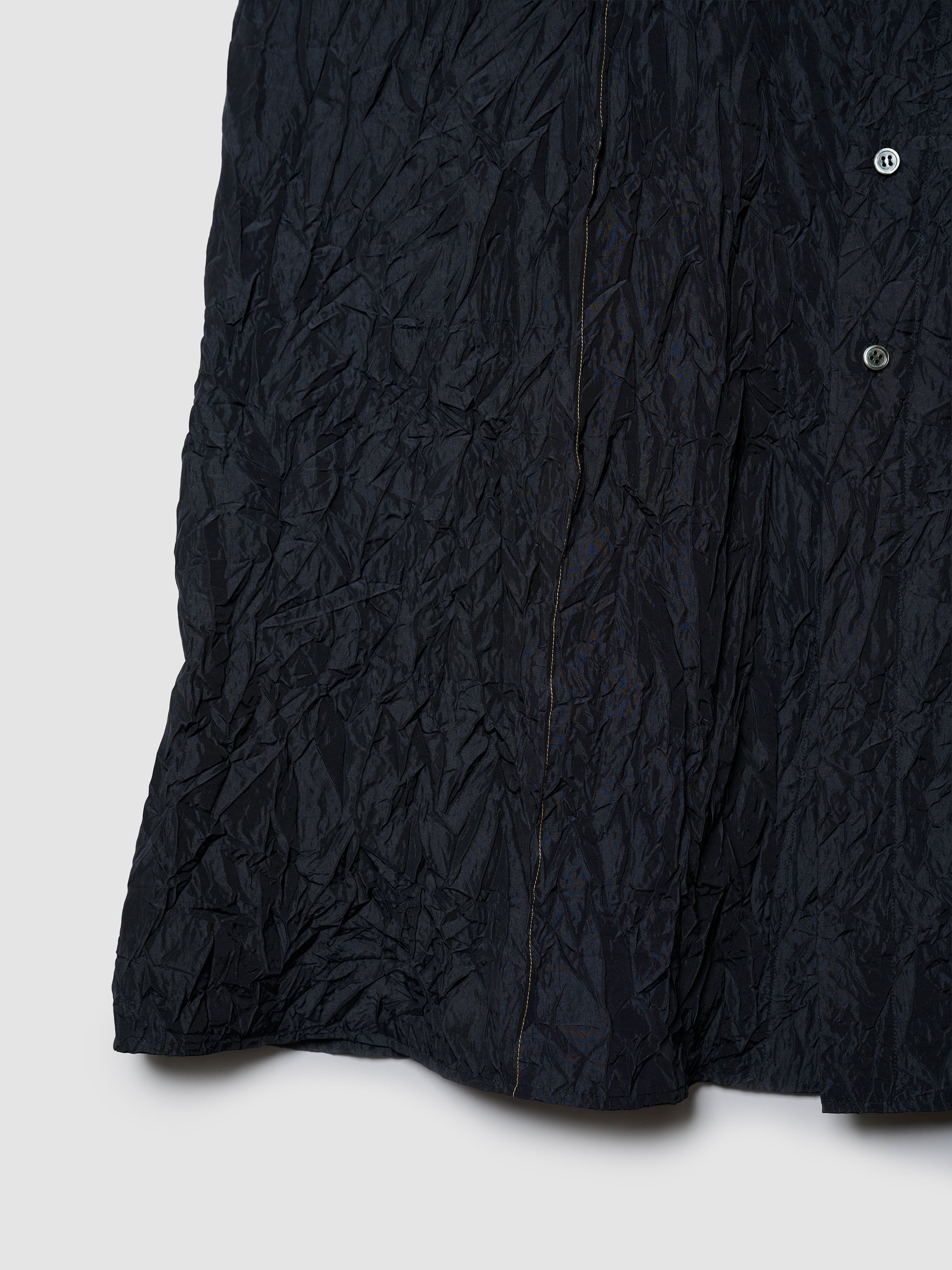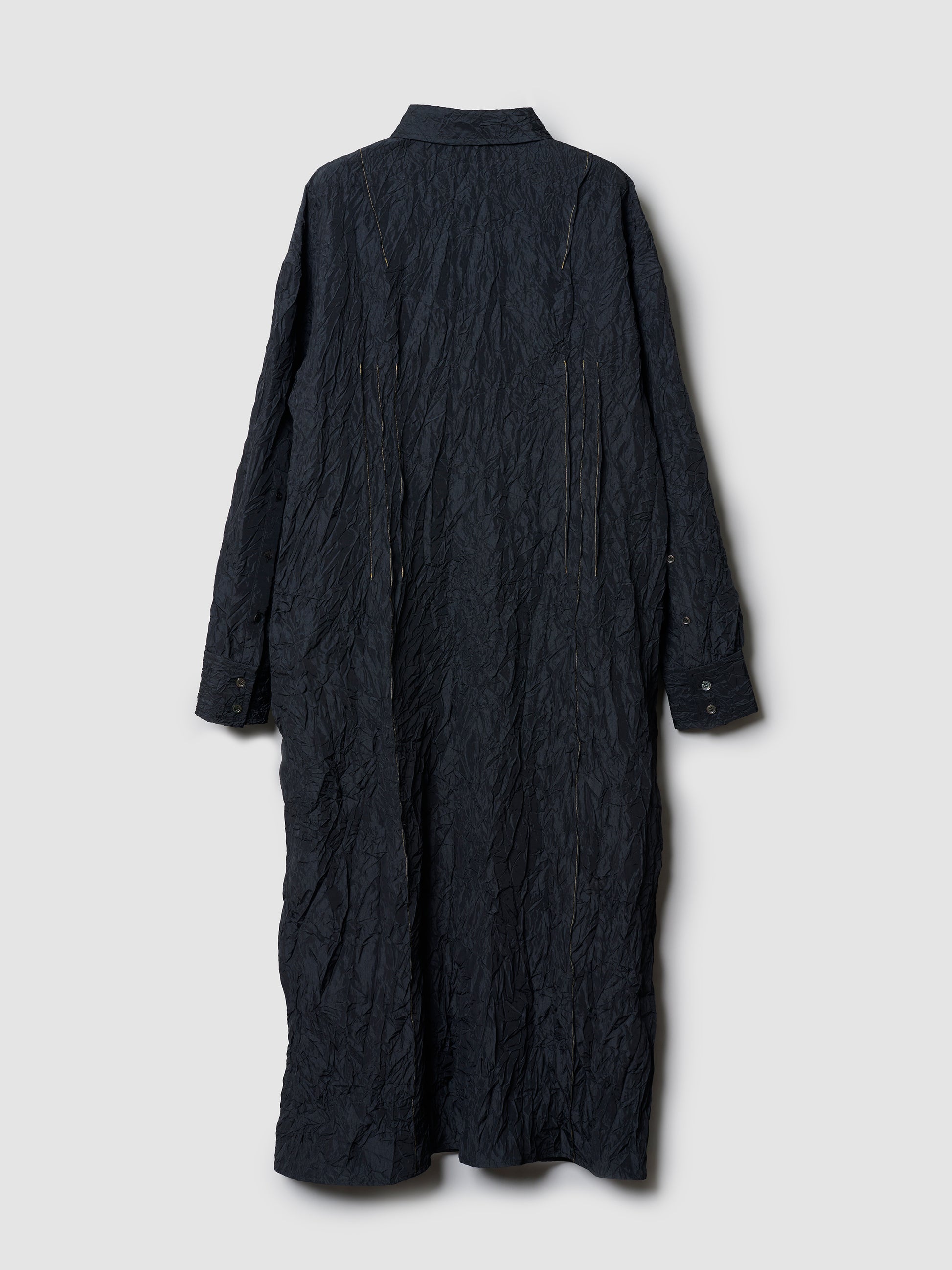 オーバーサイズのロングシャツワンピース。“たたみジワ”のイメージで前後の肩やウエストから裾にかけてあしらった長いピンタック、そしてウエストを程よくシェイプしたダーツが特徴的。脇ポケット付き。全面に施された大胆な皺加工と黄色の配色ステッチがポイントのポリタフタを使用。