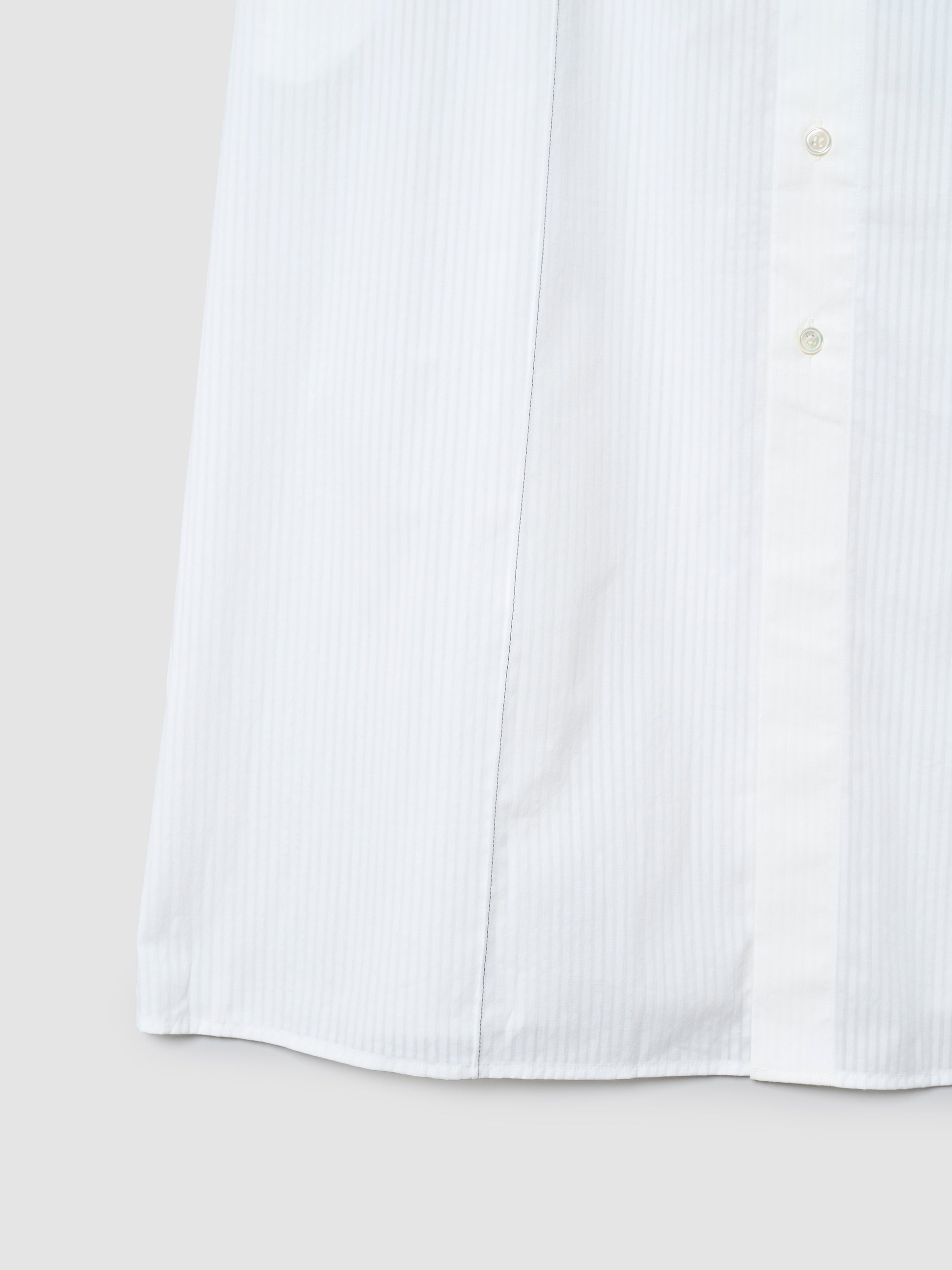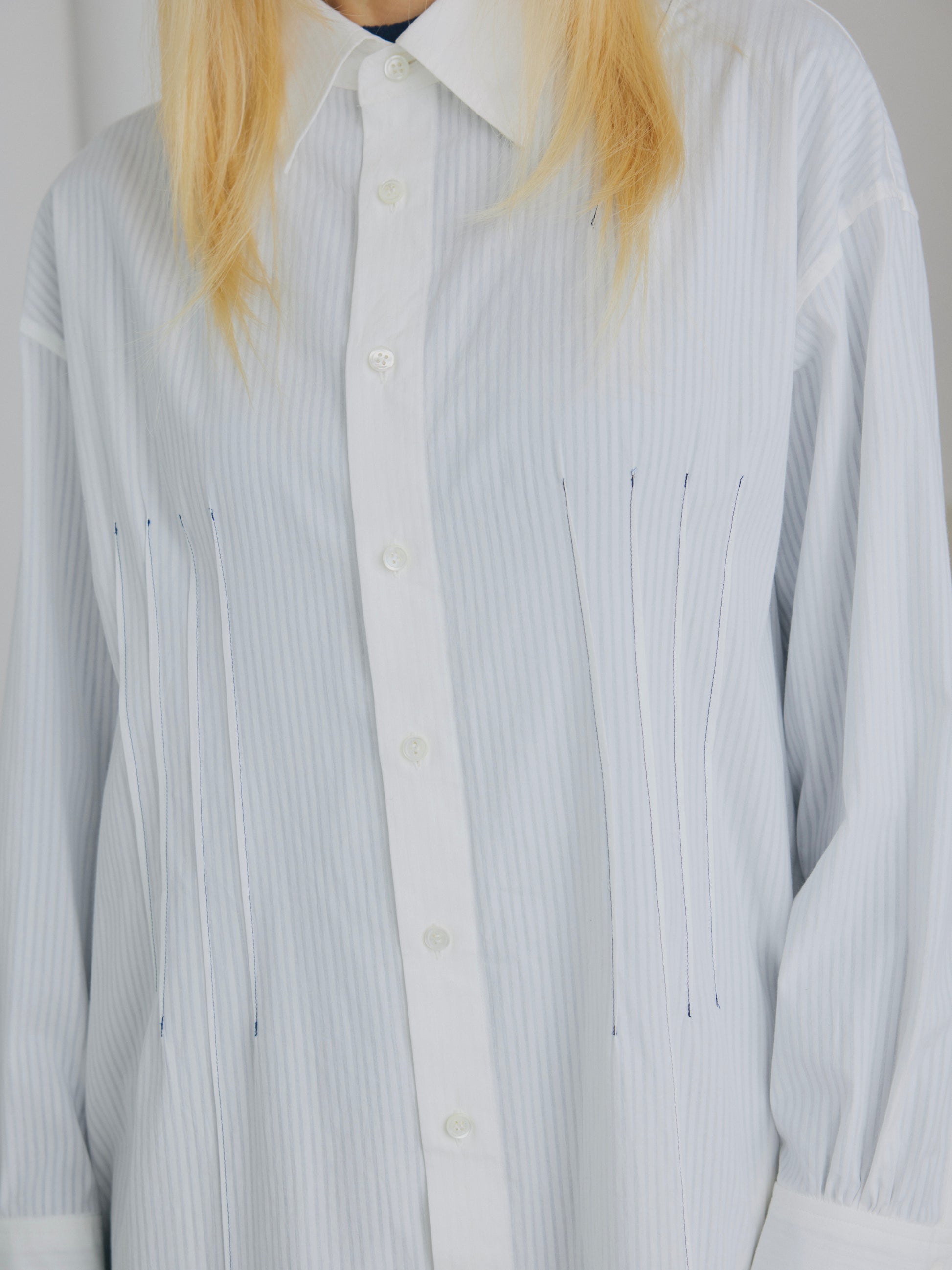 オーバーサイズのロングシャツワンピース。“たたみジワ”のイメージで前後の肩やウエストから裾にかけてあしらった長いピンタック、そしてウエストを程よくシェイプしたダーツが特徴的。脇ポケット付き。ブルーの配色ステッチをあしらったホワイトストライプを使用。